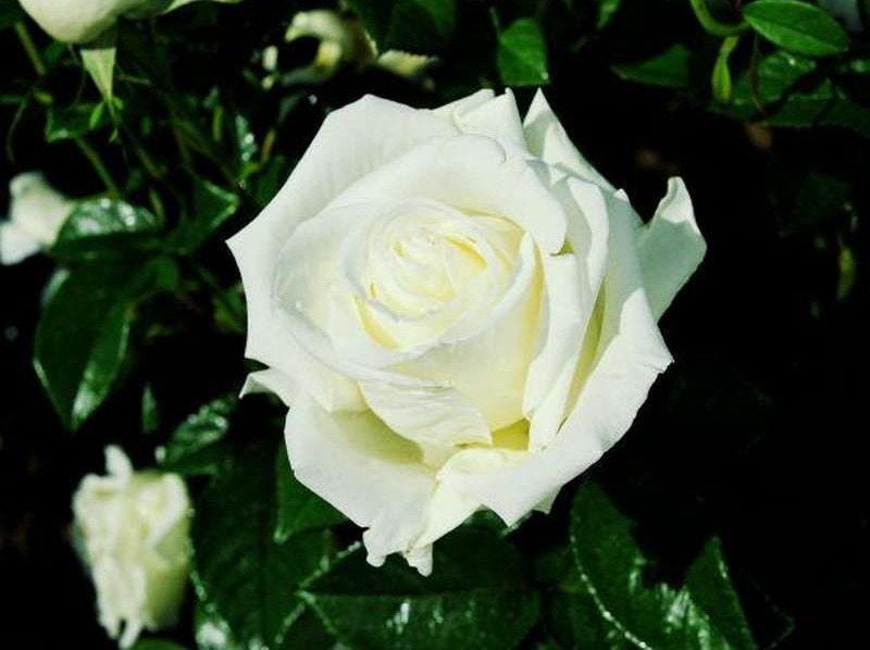 - Цветы: Великолепные белоснежные бутоны с легким кремовым оттенком, которые раскрываются в крупные, густомахровые цветы диаметром до 12 см.