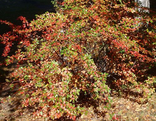 - Листья: мелкие, овальные, темно-зеленые летом и ярко-красные осенью