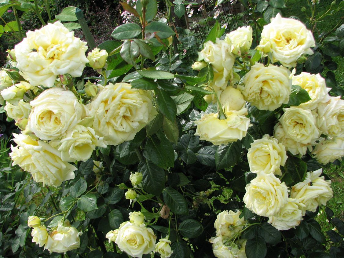 - Крупные, густомахровые цветки нежного кремово-белого оттенка